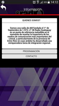Somos una radio de AM fundada el 1º de Septiembre de 1.973, LT 38 Radio Gualeguay es un punto de referencia ineludible en el momento de reseñar la trayectoria de los medios de comunicación más importantes del Litoral, y particularmente de la provincia de Entre Ríos en cuyo ámbito ha desarrollado una enriquecedora tarea de integración regional.