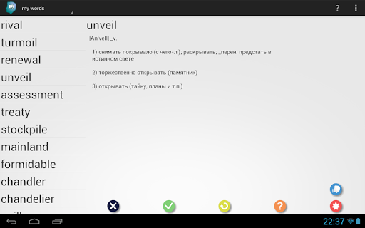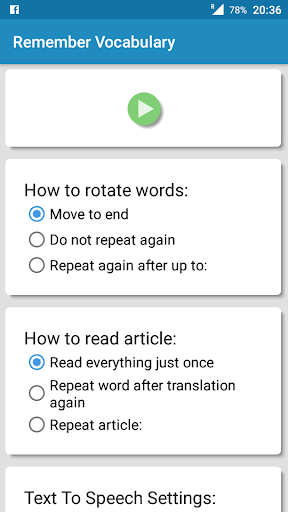 • Another very power way to learn words is to listen it like you listening the music or audio books. It use to be lots of cases when we just waste our time for the road or waiting for something etc. That is perfect opportunity to use this app and your phone like music player and learn the language simply listening the new words and its translation. It uses TextToSpeech(TTS) technology.