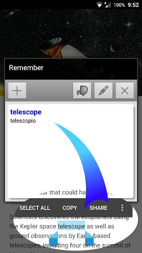• It is important not just learn the words and phrases itself but learn the ones you really need. The best opportunity to get such words right from the foreign language texts you trying to read. Just you see some unknown word you can immediately see its translation and add it into the lesson for the further learning. And keep reading do not switching into another app. Reading the real texts you will collect the really useful set of new words for learning.