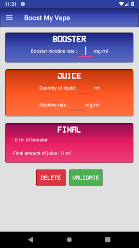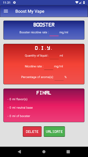 To all the vapers who make their own liquids, this application makes it possible to calculate the final nicotine rate using a nicotine booster sold in the trade.