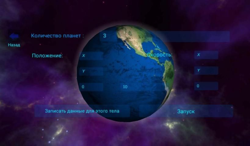 Guide section details in application (too) ... Briefly - enter the number of planets, and then for each 7 prescribes parameters (coordinates x, y, z, Velocity x, y, z and the body weight). Save data for each of the planet! All entered - click "start".