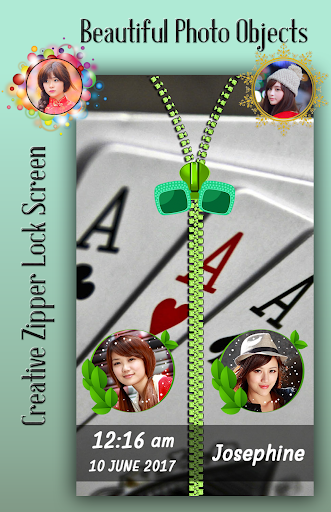 ace is made and used as a decoration. ace shines by reflection with many small flashes of brilliant light or to shine with strong emotion to be brilliantly attractive. It is a free zipper lock app for your quality android device. If you love the ace shine, then you surely want to decorate your home screen with ace zipper Lock Screen. Young girls and guys will really like it.