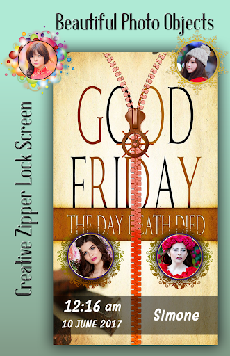 good friday is made and used as a decoration. good friday shines by reflection with many small flashes of brilliant light or to shine with strong emotion to be brilliantly attractive. It is a free zipper lock app for your quality android device. If you love the good friday shine, then you surely want to decorate your home screen with good friday zipper Lock Screen. Young girls and guys will really like it.
