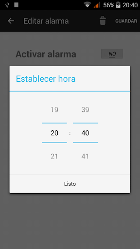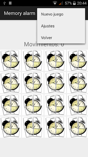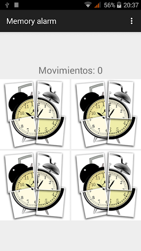 At the specified time the alarm will ring and vibrate at the same time it shows a memory game. You will have to resolve the game in order to silence the alarm. Different difficulties can be set up, choosing between