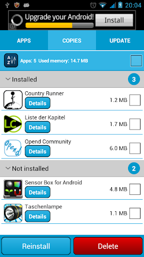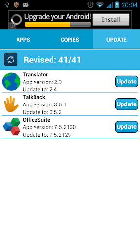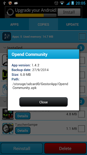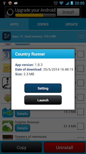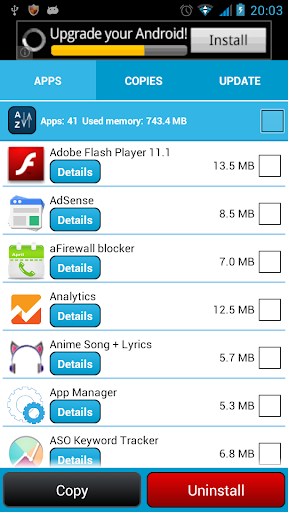 To help you manage your applications, GestorApp creates backups. These copies will be stored in external memory and will be available in the panel "COPIES". In this panel will be listed or backup copies you have made with GestorApp, to enable you to manage your taste.