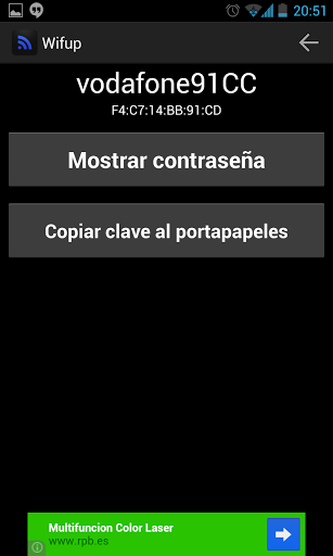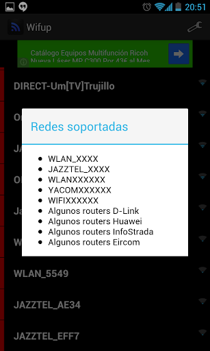Remember! You do not use wifi that is not yours!Recover your passwords and WLAN_XXXX YACOMXXXXXX JAZZTEL_XXXX WLANXXXXXX WIFIXXXXXX Some Routers D-Link and Huawei, in a few seconds!If the network password is the default one you get with this tool in no time!If the network password is the default one you get with this tool in no time!Easy to use, click above of the network and click above copy to the clipboard and ready! :)