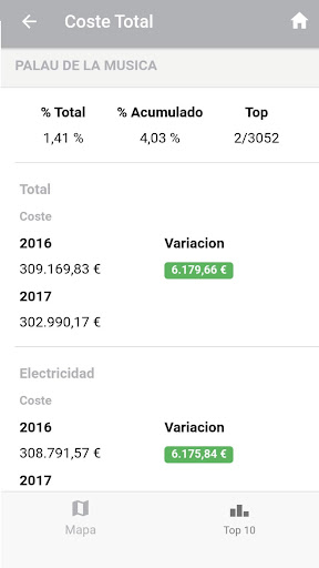 • Paghahambing ng pagkonsumo ng kasalukuyang taon sa mga nakaraang taon. Mga mungkahi sa iyong konseho ng lungsod o samahan.Isinasama rin ng tool ang pagpipilian upang magpadala ng mga mungkahi na nakakabit ng isang imahe na kasama nito.Ang mga mamamayan ay maaaring at dapat tulungan ang mga pampublikong administrasyon at organisasyon upang mapagbuti ang pagkonsumo ng kanilang mga pasilidad at maiwasan ang basura.Sa madaling sabi, ang mga pagkonsumo na ito ay may gastos.