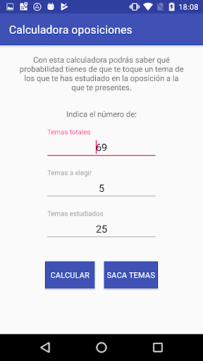 - Una calculadora de temas. Calcula cual es la probabilidad de que te toque en tu oposición los temas estudiados. ¿Cuantos temas hay en tu oposición? No importa, esta app te sirve para cualquier oposición. Sabiendo los temas totales de la oposición, cuantos temas te dan a elegir los tribunales de oposición y cuantos temas has estudiado para opositar, se puede calcular mediante una curva de probabilidades que porcentaje de que toque uno de los temas estudiados.