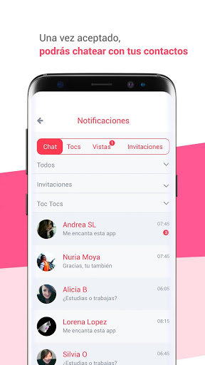 Contacta con otros usuarios gratis. Envía toctocs para contactar con otra gente y si te aceptan la llamada, se te abrirá un chat.
