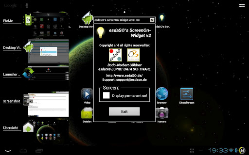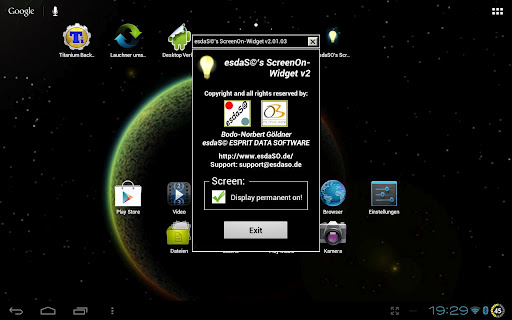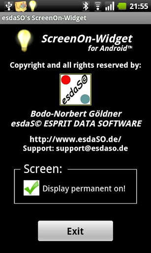 The tool "esdaS©'s ScreenOn widget for Android" gives users a simple way to prevent the possibility, that the screen is turned off. This is interesting for Android developers, software that perform the tests on a real Android device, not in the emulator. The tool works both as an application as well as a widget.