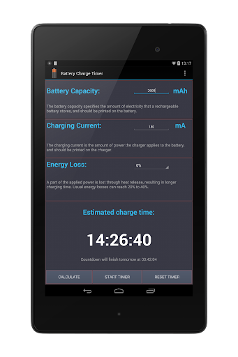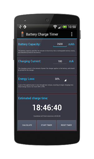 Battery Charge Timer allows you to evaluate the time required to charge your rechargeable batteries, depending on the battery capacity, the charging current and the energy loss. If you want to be alerted when it's time to disconnect the charger, you can set a timer to notify you. If you want to make the most of your rechargeable batteries, this app is for you!