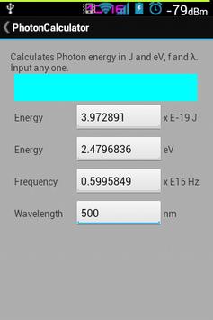Calculates photon energy, in joules or eV, wavelength in nm and frequency. Input any one to get all the others.