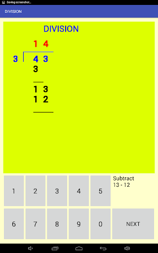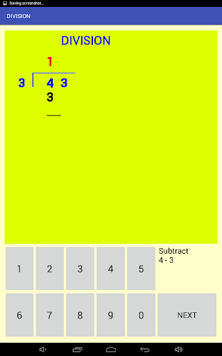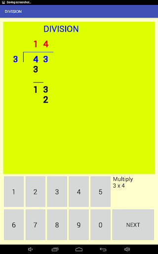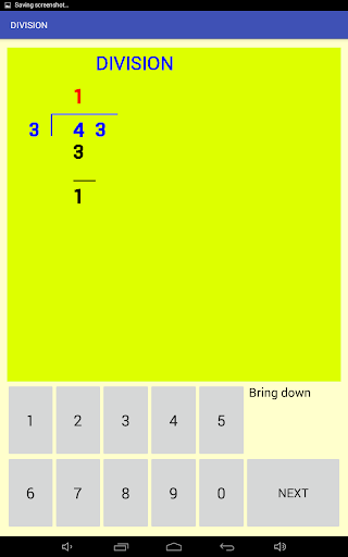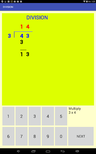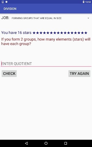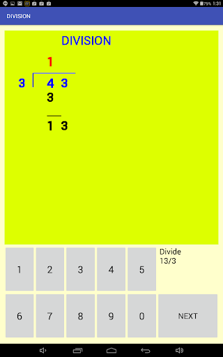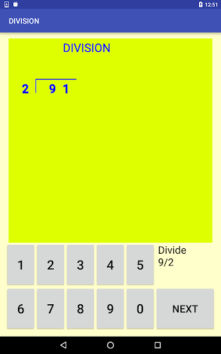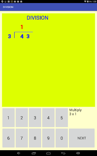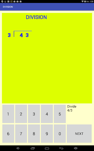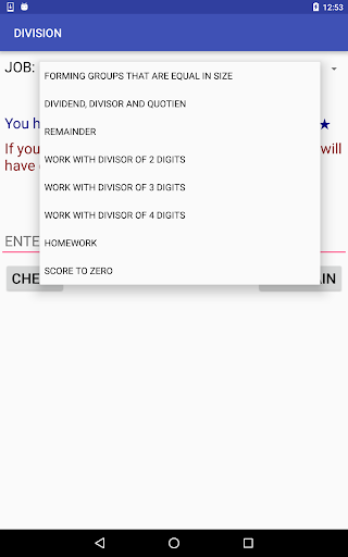 The interface has been simplified as much as has been possible. The application starts in an screen with a divisor of 1 digit and the instructions to make the proposed division. When you press the back button, the application shows the screen with the simplest task and you can display a dropdown menu with all the available options: