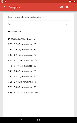 "HOMEWORK" allows send by email some divisions and its results with the number of digits used last time.