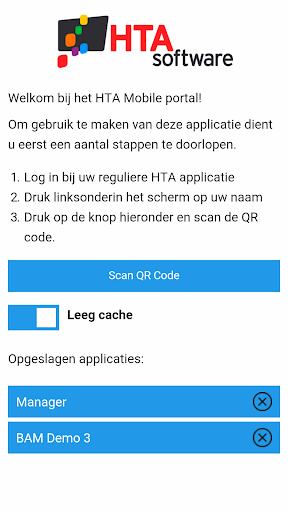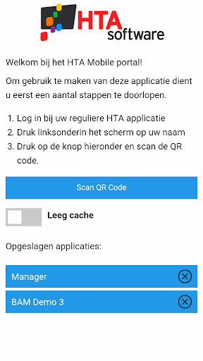 Na het downloaden van de app kan deze alleen geactiveerd worden door de bijbehorende QR-code te scannen. Deze kan gevonden worden in het scherm van uw gebruikelijke HTA Software applicatie door op de gebruikersnaam link onderin te klikken. (te vinden in AVM2020, BAM2020, CRM2020, KRM2020, VIM2020)
