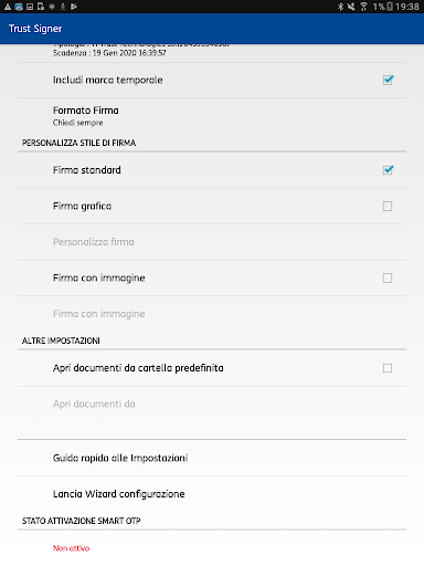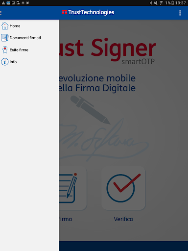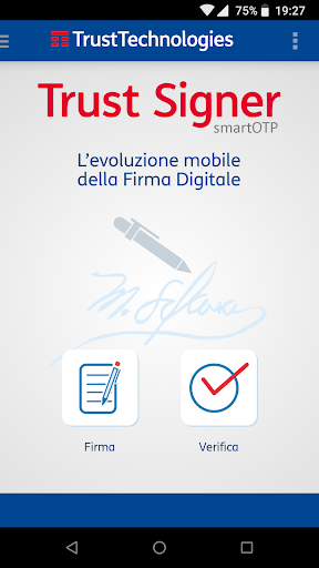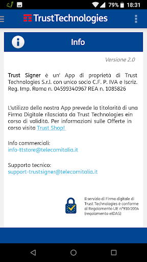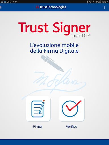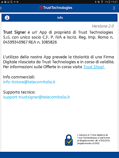 সর্বশেষ আপডেটটি অ্যান্ড্রয়েড বা উচ্চতর সংস্করণ 5.0 প্রয়োজন। যদি আপনার কোনও ডিভাইস থাকে তবে নতুন সংস্করণগুলিতে এটি আপডেটযোগ্য নয় তবে আপনি পিসি / ম্যাক / লিনাক্সের জন্য ট্রাস্ট সাইনার 'সফটওয়্যারের মাধ্যমে ডিজিটাল স্বাক্ষর পরিষেবাটি ব্যবহার করতে পারেন, যা সাইট থেকে ডাউনলোডযোগ্য https://www.trusttechnologies.it/download/software /। আরও তথ্যের জন্য লিখুন: info-ttore@telecomitalia.it।