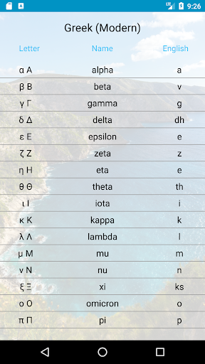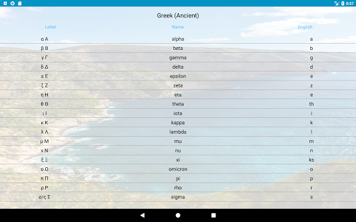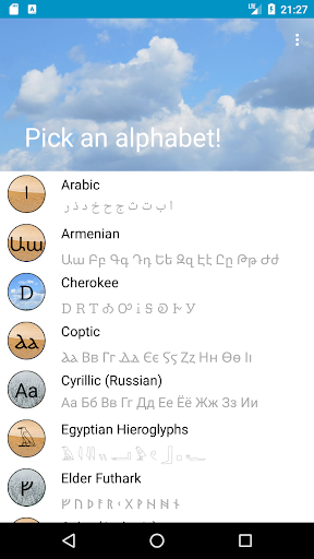 With Alphabets you will learn how to read 53 alphabets: American Sign Language, Anatolian Hieroglyphs, Arabic, Armenian, Aurebesh, Baybayin, Braille, Cherokee, Coptic, Cuneiform, Cyrillic, Devanagari, Egyptian Hieroglyphs, Elder Futhark, Futhorc, Ge'ez, Georgian (Asomtavruli), Georgian (Mkhedruli), Georgian (Nuskhuri), Glagolitic, Gothic, Greek (Ancient), Greek (Modern), Hebrew, Hiragana, Inuktitut, Katakana, Khmer, Klingon, Korean (Hangul), Latin, Linear B, Lontara, Lycian, Lydian, Malayalam, Maya, Mongolian, Morse, N'Ko, Neo-Tifinagh, Ogham, Old Italic, Old Turkic (Orkhon), Phoenician, Semaphore, Syriac, Telugu, Tengwar, Thaana, Thai, Tibetan and Younger Futhark.