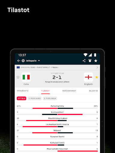 • VALTAVA VALIKOIMA: Seuraamme jääkiekkoa, jalkapalloa, salibandyä, koripalloa, pesäpalloa ja 33 muuta urheilulajia sovelluksessamme. Katamme yli 6000:ta kilpailua ympäri maailman - pelkästään jalkapallosta voit seurata yli 1200 eri kilpailua!