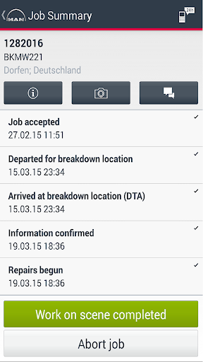 The App shows all the information clearly arranged and the technician automatically receives the navigation data to the breakdown location. Standardized reports for the transmission of the current status reduce and simplify the individual steps of the process. Additonally there is the possibility to take pictures and send them case-related to the breakdown management software.