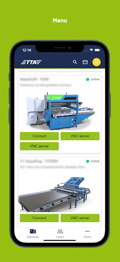 TTA Connect App, allows easy and secure access to your machines via any mobile device. Connect remote to your TTA-machine, whether you're at home or need information in a meeting. Worldwide and uninterrupted access to your machine is guaranteed. You can manage your TTA-machines independently and give access to other employees in your company.
