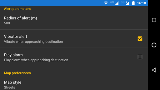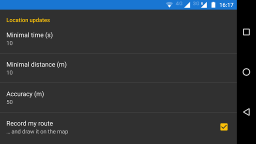 On a short journey in the city, a small minimal time (say 10 seconds) and a relatively small radius (say 200 meters) of alert can be set. On a long overnight journey, you might prefer to save up your battery, and set a long minimal time (say 120 to 600 seconds), and a rather large radius (say 5000 to 60000 meters).