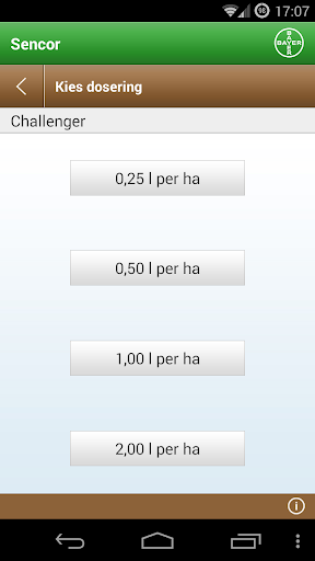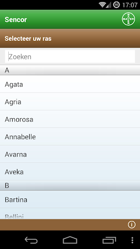 Het eerste scherm bevat een alfabetische lijst met de rassen waarvoor informatie beschikbaar is. Na keuze van een ras verschijnt in het tweede scherm de keuzemogelijkheid ‘toepassing voor-opkomst dan wel na- opkomst’ Na keuze van de voor-opkomsttoepassing kunt u kiezen uit een dosering uit een reeks ( 0,25-0,5-1,0-2,0 l/ha); bij de na-opkomsttoepassing is één gebruik opgenomen (LDS toepassing met 2x 0,15 l/ha). De app presenteert op basis van uw keuzes het effect op de aardappelplant voor verschillende doseringen van Sencor en geeft u de mogelijkheid de inschattingen voor de verschillende doseringen snel te vergelijken.