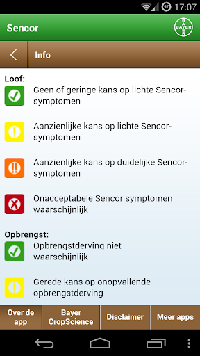 Deze handige app geeft aan de hand van de kleuren groen, geel, oranje en rood een inschatting van de kans op gewasreactie en de mate daarvan, voor loof en opbrengst. De inschatting is uitgewerkt voor de voor-opkomsttoepassing én voor de LDS-toepassing van Sencor voor rassen geteeld voor consumptie of zetmeelproductie. De app is vooralsnog niet geschikt om te worden gebruikt voor de pootgoedteelt.