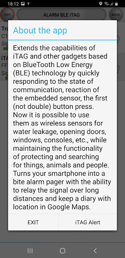 Expands the capabilities of iTAG and other gadgets based on BlueTooth Low Energy (BLE) technology, instantly responding to disconnection and restoration of communication. Allows them to be used as alarm and security devices while maintaining the functionality of BLE trackers.