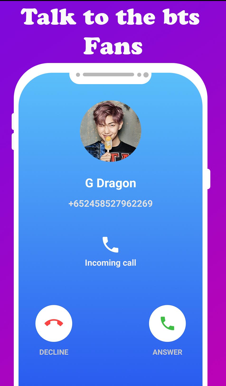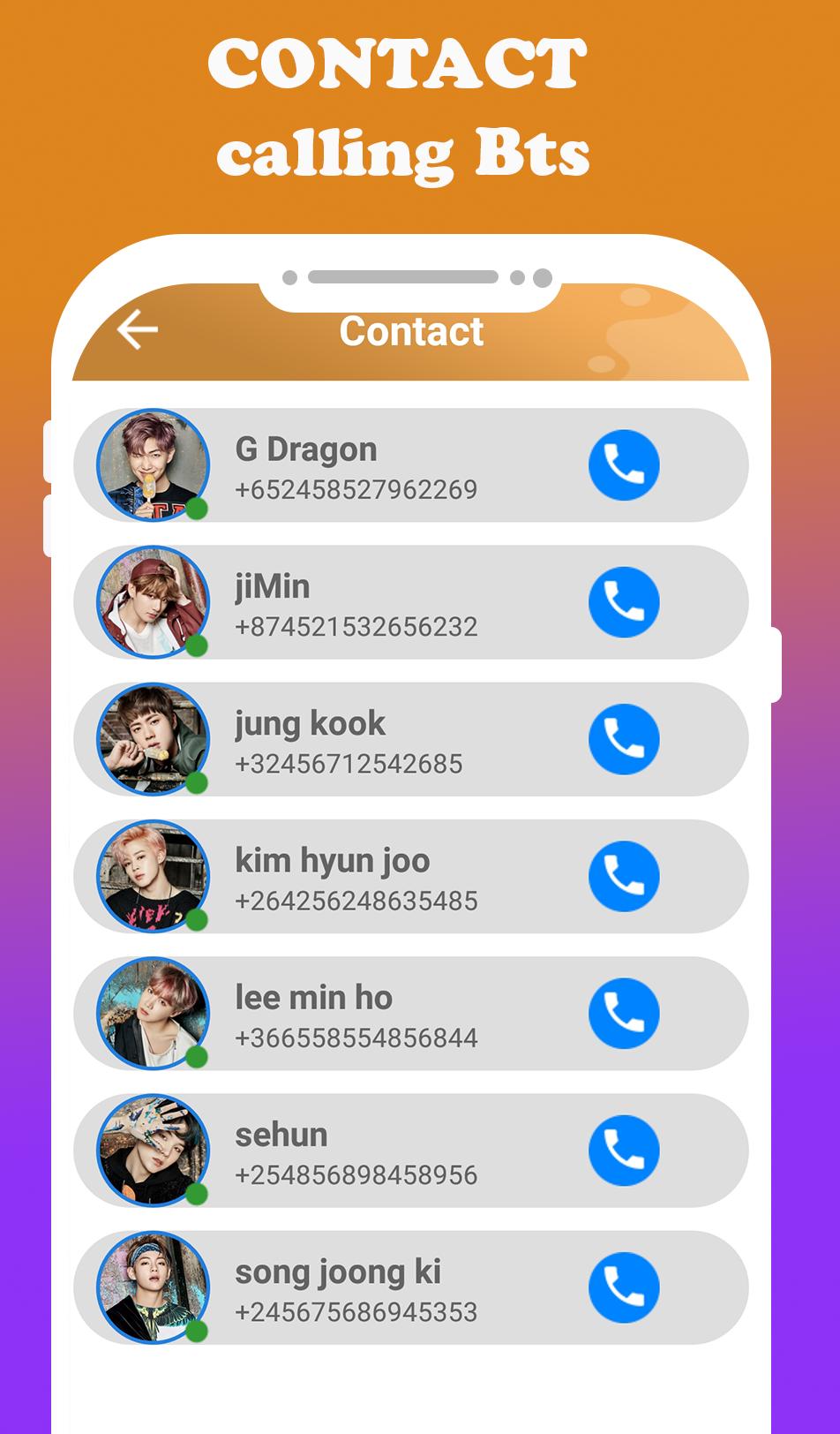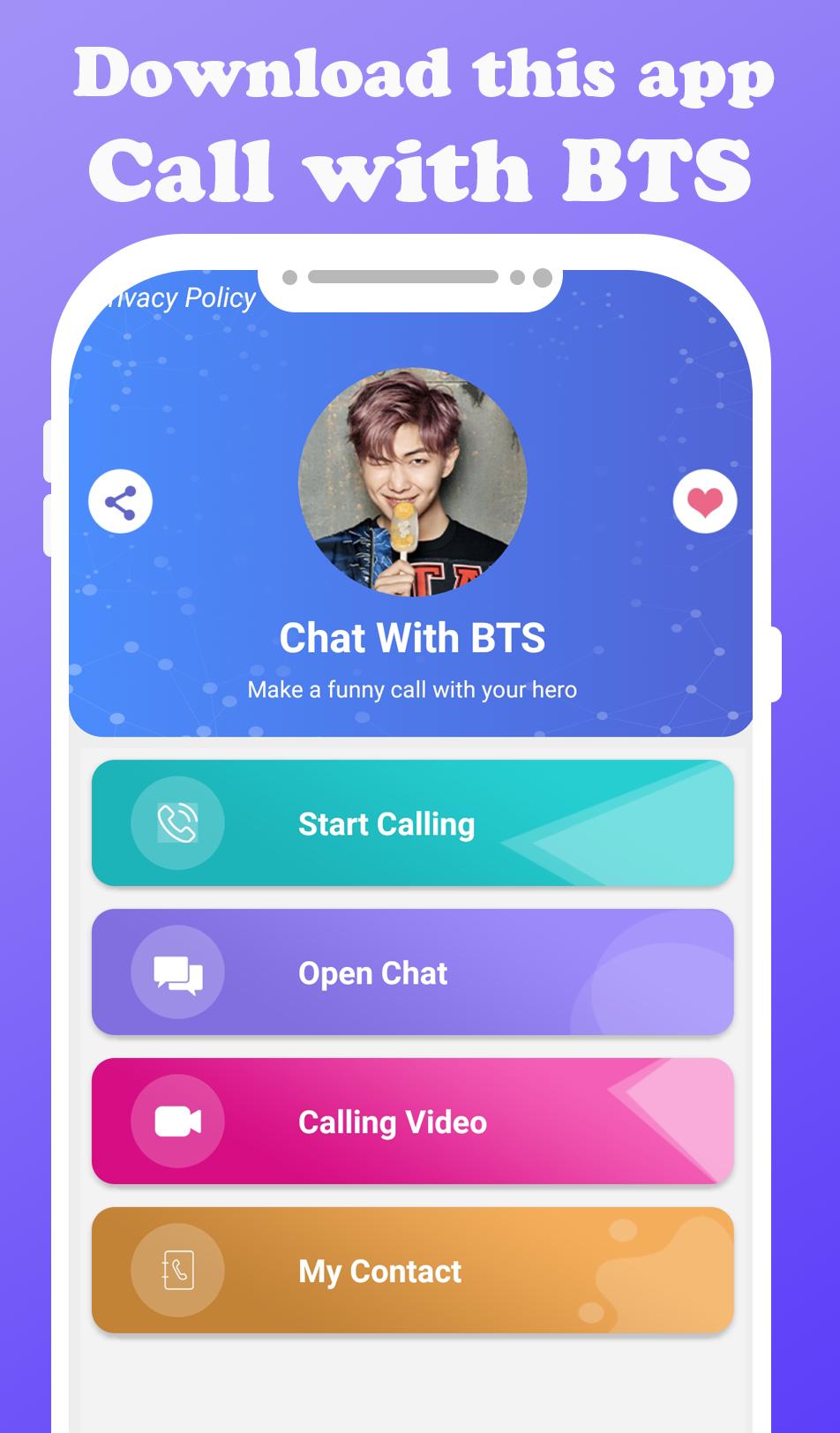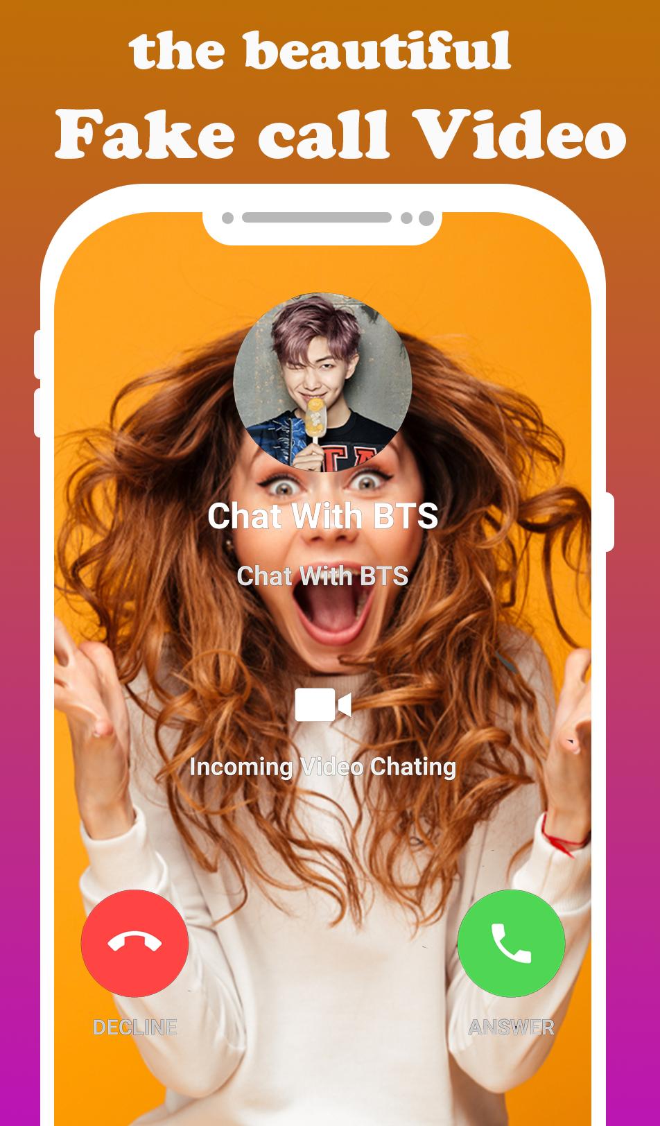 fake call live chat video is an application that helps you get a call right away from Jungkook, Hope,V, Suga ... talking to Bts, Looking at Bts members from the call, it is a dream for fans of Bts music group.