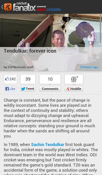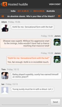 When your team is in action, check in to the match to discuss the game with friends in private group chats called Huddles. Alternatively, join a public Hosted Huddle to chat with fans from Facebook, Twitter, Google or ESPNcricinfo all in one place, all connected by the live game. With real-time stats, score updates and ESPNcricinfo ball-by-ball summaries sitting alongside your thoughts on play as it unfolds, fanatix cricket is the definitive live social mobile experience for cricket fans.