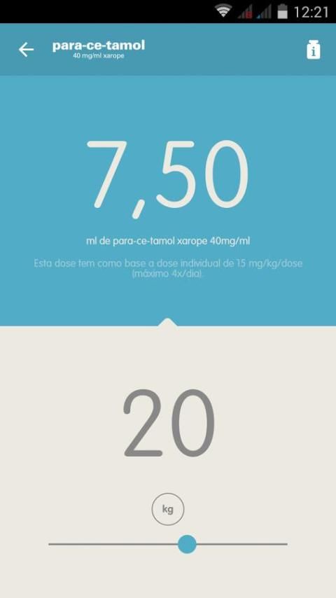- cálcular: introdução do peso da criança através de um “slider” ou clicando e introduzindo. É mostrada a dose correcta em tempo real.