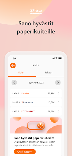 Het inschakelen van de app maakt automatisch elektronische ontvangsten mogelijk.Elektronische bonnen worden bijna in realtime bijgewerkt wanneer de Plussa -kaart wordt gebruikt voor aankoop.