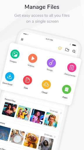File Explorer(Manager) smart categories for different types of content, images gallery and music player for pre-listening your music or play it in the background.