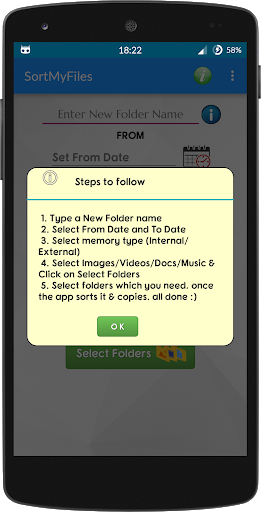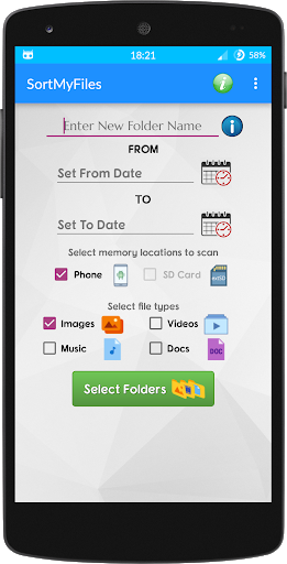 SortMyFiles is a special application which helps you to sort Images(jpg/jpeg/png), Videos(mp4, wmv, mkv, avi, 3gp), Music(mp3, wav, aac, wma,ogg,m4a ,amr), Documents(pdf, doc, docx, ppt, txt) with in a specifi date and time provided by the users.