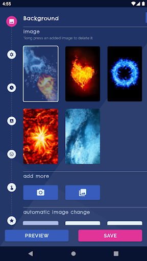 You can choose one of many background pictures for Fire & Ice Live Wallpaper, with hot fire wallpaper, burning flames, frozen blue, and cold ice pictures, sparkling stars animation and burning flames backgrounds, all free wallpapers, or you can add your own pictures! You can set up an automatic background changer with magic touch!