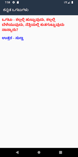 This app will give you information about riddles in kannada. Many of you love reading this app, learning about the facts, asking the same question with your friends and family. Finally you will enjoy this app.
