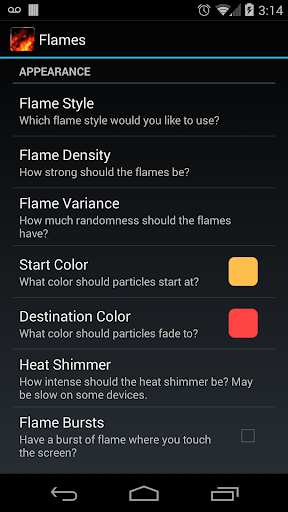 A beautiful live wallpaper of moving fire and flame, this full version features lots of settings for flame density and motion, flame color, heat shimmer, color shifting, custom backgrounds, touch response, and more!