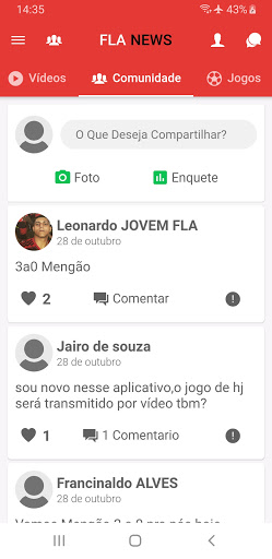 Somos um aplicativo onde você consegue interagir criando e comentando postagens de outras pessoas, mas sem perder o foco do app, que é passar informações e falar dos jogos do flamengo ao vivo e em tempo real para vocês, veja vídeos de matérias do flamengo e da fla tv, as melhoras notícias do Flamengo estão aqui no aplicativo Notícias do Flamengo Hoje.