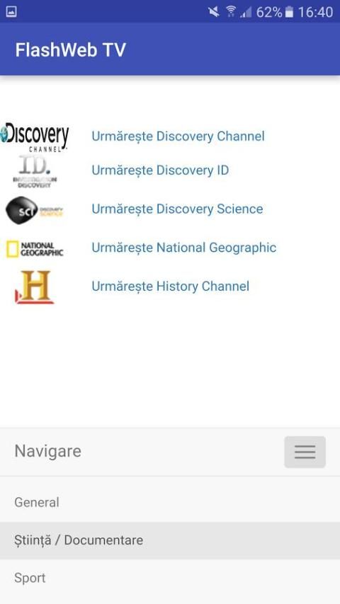 By FlashWeb TV anytime and anywhere you have access to the most popular and sought general channels, documentaries, news and sports from Romania - your favorite shows and competitions for free, directly to your phone!