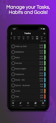 Flynow is a perfect app for those looking to improve their productivity by managing tasks, habits and goals. The app uses the best methods for managing tasks, habits and goals. In addition, it uses gamification to encourage its users to carry out their activities. Another differential of the application is the use of statistics to provide feedback to the user regarding its performance. For time/task management the app uses the Triad of Time method, for habits management the app uses the habit loop. Finally, to perform goal management, the application uses the SMART method.