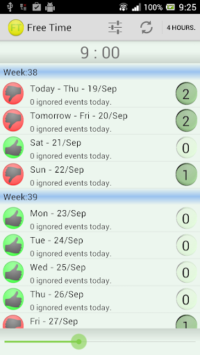 Free Time provides a quick and easy way to find an available slot in your calendar. You select a duration and a start hour and the app will let you know which days are available to book an event. It uses your default calendar settings, so any calendars visible in your ordinary calendar app will be used to find events by Free Time. Once you've found a time to book, you simply long-press the day to open your calendar event input page. You will also be able to remove events and mark events as "non-blocking". Non-blocking events will not make the app show a conflict even when trying to add an event on top of it.