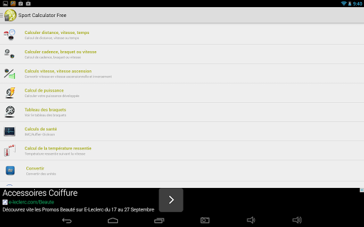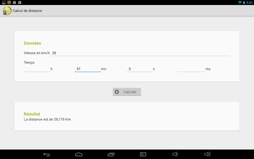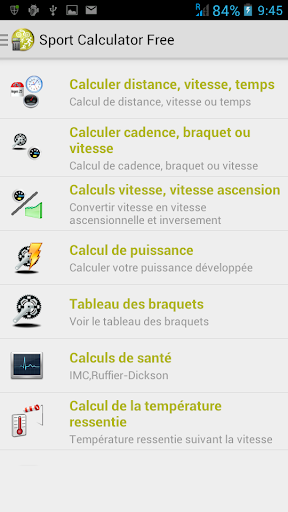 SportCalculator allows by default to calculate your distance given speed and time, speed given distance and time, time given distance and speed, BMI, Ruffier-Dickson index, feeled temperature, convert units between them.