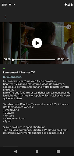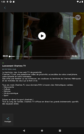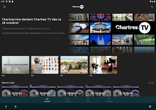 Ang Chartres TV ay isang platform ng video na bukas na bukas sa kayamanan, sa likod ng mga eksena ng teritoryo ng Chartres Métropole at ang mga kwento ng mga nagpapasaya nito. , kultura, kasaysayan, buhay pang -ekonomiya at isport na may live na pagpapakalat ng mga pangunahing kaganapan ng mga piling koponan.