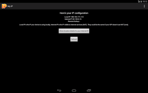 This is a simple app to get your local IP (the one your phone has been given by your ISP) and your Internet IP (the one visible through Internet).