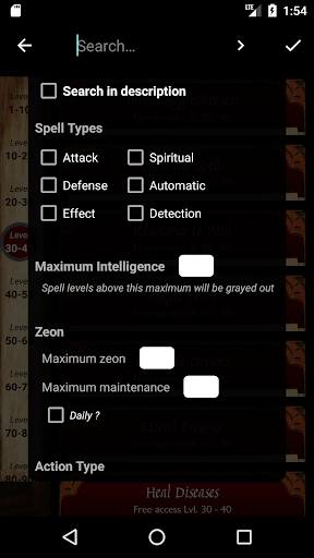 - Spell filtering on a donate path or onto your own list of spells, with every useful criteria : search a spell by text, by spell type (attack, spiritual…), by level of zeon, intelligence etc.