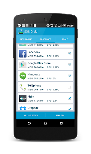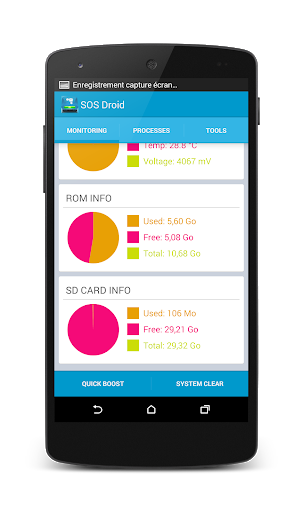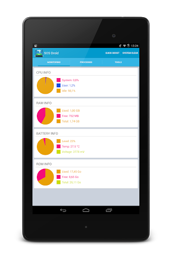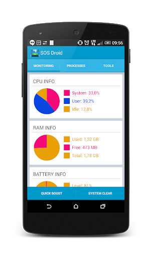 SOS Droid displays the status of CPU, memory, and battery in real time, allowing you to monitor system performance.