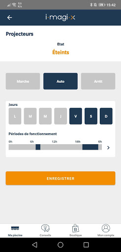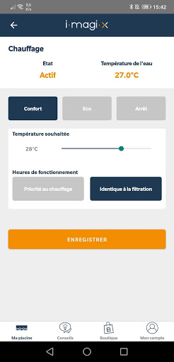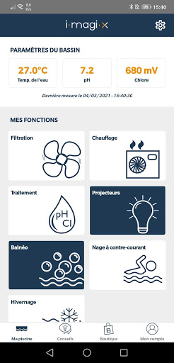 The application is accessible via a smartphone or tablet and allows you to easily manage the pool's parameters from the poolside or remotely, as well as many other functions (water disinfection, heating, lighting, Balneo or Counter-Current Swimming functions, pool cleaning).