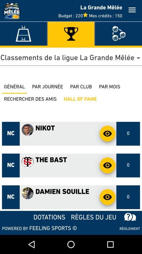 At the end of the matches, each player earns points based on their actual performance. These points obtained represent the sum of "Team" points (in proportion to the player's actual presence on the field) and individual points which depend on the player's personal statistics (try, penalty, tackle, yellow card, red card, etc.) . The participants thus obtain a total of points for each day thus competing as manager of the day, the month and the year. Many prizes are to be won on La Grande Mêlée!