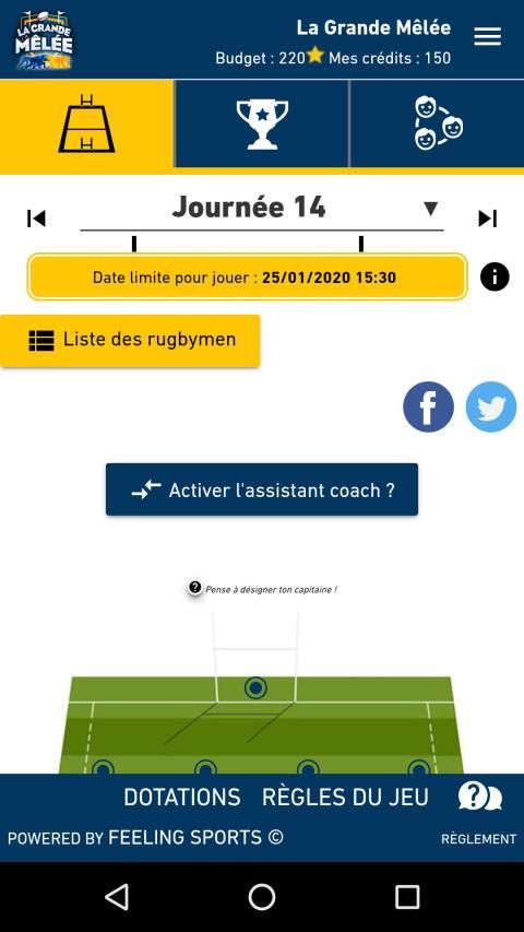 On each day of the championship on La Grande Mêlée, the participants of the game select on their "Match sheet" 15 holders and up to 3 substitutes. They can also select their "captain" among the titular players (his points will count double) and their "SuperSub" on the bench (his points will count triple if and only if the latter starts the match in real life as a substitute ).