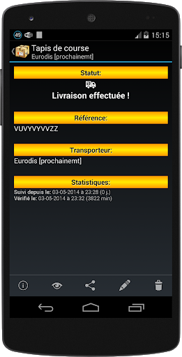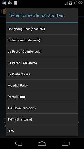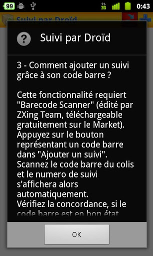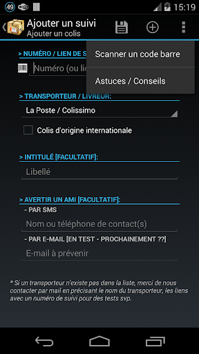 • Saisie automatique du n° de suivi via code barre (requiert Codes-barres, ou Barcode Scanner ou Google Goggles)